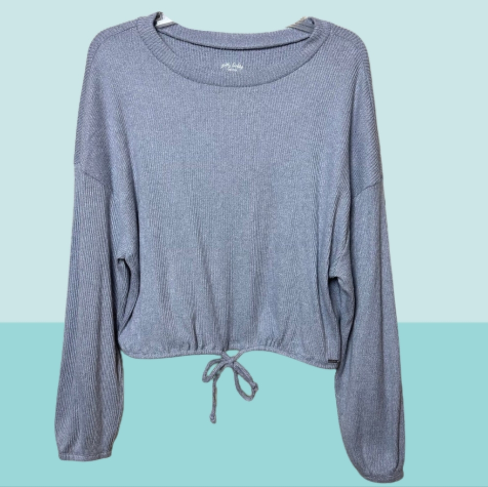 Made by Gilly Hicks by Hollister, this top is a cute twist on a classic style. This sky blue, cropped crewneck features a pullover design dropped shoulder, an adjustable drawstring waist tie ,and a soft, ribbed fabric. The ribbed fabric is buttery soft and offers the perfrct amount of stretch for a relaxed fit that will keep you cozy this season. Would pair well with black leggins and chealsea boots for casual wear or dressed up with vest, jeans, and boots for an effortless winter-ready fit.