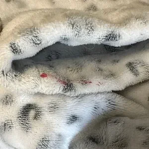Soft light gray robe with subtle pattern. Includes hood and tie belt. Ideal for relaxation. Some nail polish on sleeve