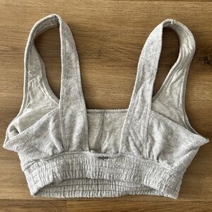 Soft and cozy Gilly Hicks by Hollister bralette in a light gray terry cloth material. Features a stretchy ruched underband for a comfortable fit and wide straps for extra support. Perfect for lounging or casual wear. Gently used with no signs of wear.