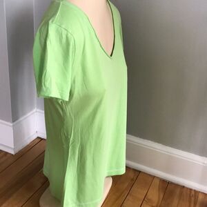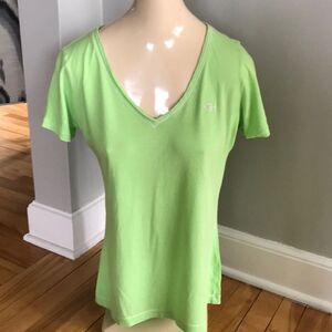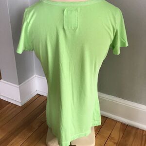 Gilly Hicks bright lime V neck short sleeve tee. Topstitched double layer, raw edge neckline. GH embroidered logo left chest. Very soft. No fabric content tag. Size small. Excellent condition. Nonsmoking home.