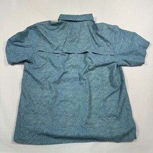 -Style tags: short sleeve, blue with pattern, vented, button up, button down, collared, fishing, lightweight