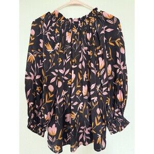 Add a touch of effortless elegance to your wardrobe with this Gilner Farrar floral blouse. Featuring a striking black base with pink and orange floral print, this top blends boho-chic vibes with modern sophistication. The balloon sleeves with ruffle cuffs and gathered neckline create a flattering, feminine silhouette that transitions seamlessly from day to night.