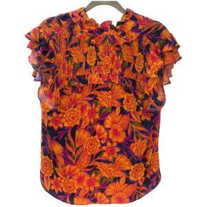 Vibrant floral print Sienna blouse in shades or pink, orange and blue. Smocked and ruffle detail at shoulders and across back. Flutter sleeves. Ruffle tie neckline. 100% Viscose. Dry clean.