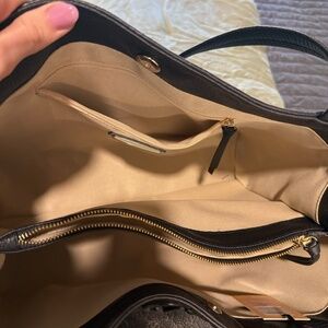 The Valentino by Mario Valentino Ollie Dollaro Monogram Leather Tote is the perfect combination of elegance and functionality. Made in Italy, this stunning black leather tote features an embossed logo accent, exterior pocket, and tassel detailing for a touch of designer flair. Complete with a spacious fabric-lined interior and convenient interior pockets. The tote measures 15.5 inches wide x 11 inches high x 7.5 inches deep with top handles that boast an 11-inch drop. It has an open top with a magnetic closure.