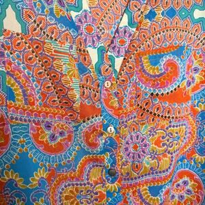 Vibrant paisley top with a mix of red, blue, and orange hues. Perfect for adding a pop of color to your wardrobe.
