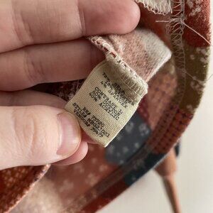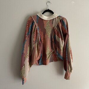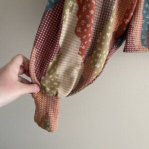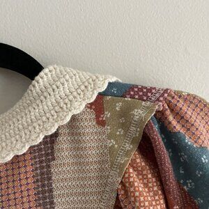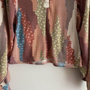 Gimmicks BKE Women S Patchwork Mixed Print Fleece Boho Crochet Collar Dolman Henley Top.