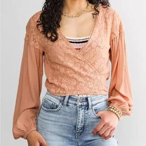 Gimmicks Small Crinkle Wrap Lace Tie Top peach orange long sleeve