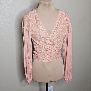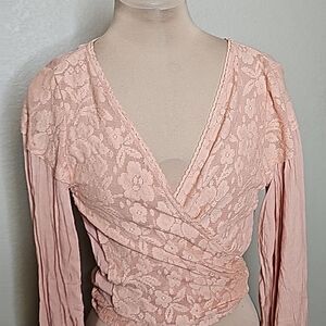 Gimmicks Small Crinkle Wrap Lace Tie Top peach orange long sleeve in excellent condition, wear 2 ways, flowy blouson sleeves
