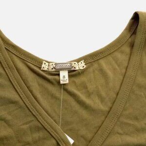 Chic Gimmicks women’s juniors top in size Small, perfect for casual outings or layering. Features olive drab green color, sleeveless design, and flattering front ruching for a stylish, feminine touch. New with tags (NWT).