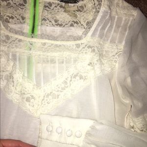 This is my all time favorite shirt :( time to let go ..too small. Button sleeves.. Sleeves are loose .. Front and sleeves are sheer. Green zipper on back. Gorgeous lace details