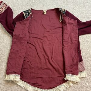 Keywords: boho cardigan, fringe jacket, ethnic pattern, festival wear, burgundy cardigan, embroidered jacket, bohemian style, hippie fashion, layering piece, folk pattern, tribal print, fringe trim