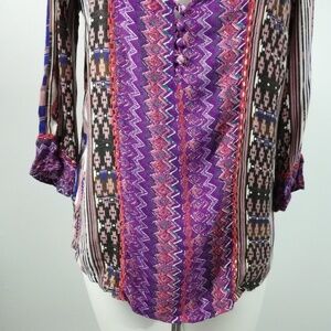 Design: Embroidered peasant blouse in an ethnic, tribal print. V neck with buttons and 3/4 length sleeves.
