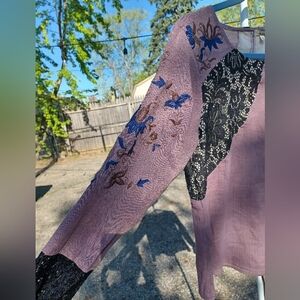 Elegant purple blouse with black lace accents. Features floral embroidery. Perfect for a chic look.