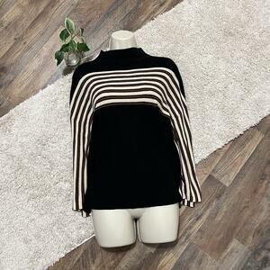 Black, brown and beige, striped, 3/4 boxy sleeves, mock neck