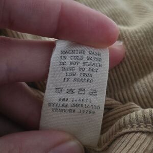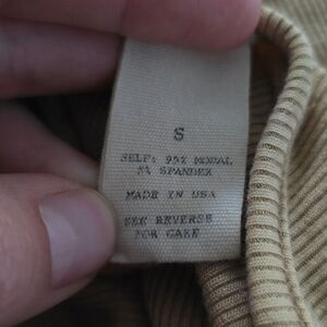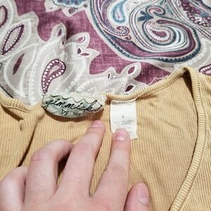 Beautiful lace crotchet detail. Material is lightweight, buttery soft and super stretchy. Color is a caramel tan gold. Very unique piece!