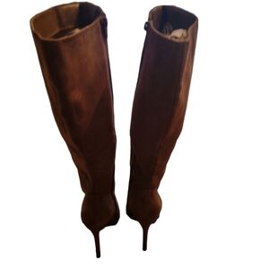 An ultra-chic velvet boot featuring a modern military design with a lace-up front, army green color, goldtone hardware may have some scratches due to normal wear, although these were only worn twice, heel approx 4 1/2", really beautiful pair of boots, microfiber upper, EUC, first pic shows actual color of boots as my pics are showing darker, dark olive green.