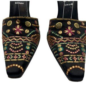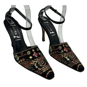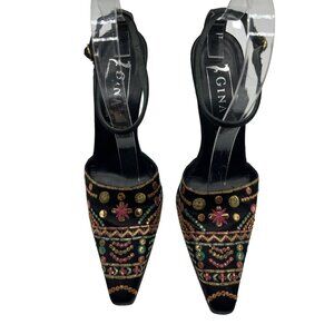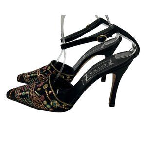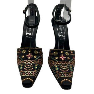 Gina Satin Pointed Toe Embroidered Detail Ankle Strap Heels