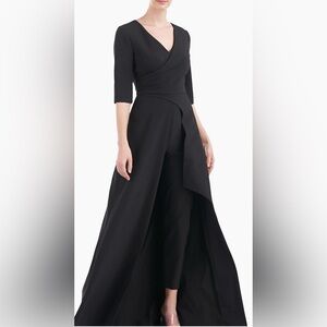 Crafted of stretch-crepe, the Gina gown by Kay Unger is designed in a walk-through style with tailored pant legs layered underneath a floor-length skirt.