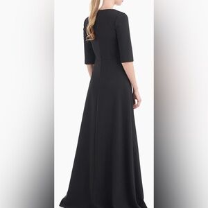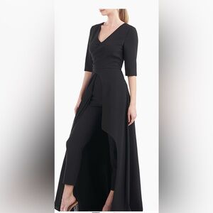Chic black high low dress. Features elegant V-neck and three-quarter sleeves. Perfect for formal events.