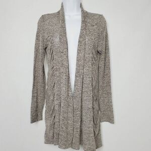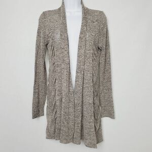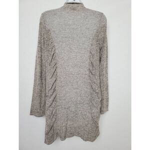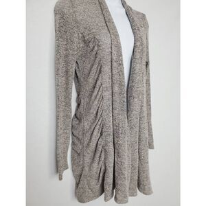Ginger G women’s size Medium open front cardigan. Marled gray knit with ruched sides for a flattering drape. Fabric blend 51% polyester, 45% rayon, 4% spandex. Made in USA. Lightweight and comfy layering piece.