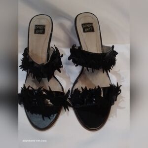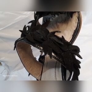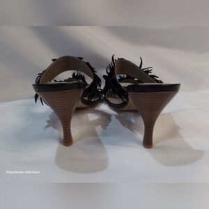 Gently worn 1 time. Leather upper, lining, and outsole. Suede like flowers. 3.5" kitten heel.