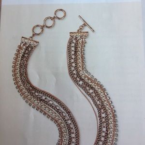 Cascading of brass with rose gold and copper plating and steel chains, brass cupchain, and Czech glass drape gracefully from a bar and chain. Never worn with original box.