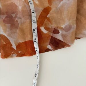 Details: Watercolor-inspired abstract print in warm orange, coral, and blush tones. Slightly longer back hem for a flattering silhouette.