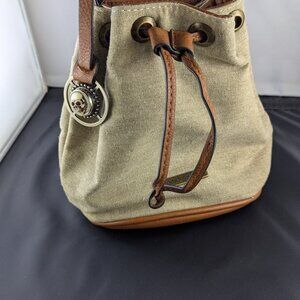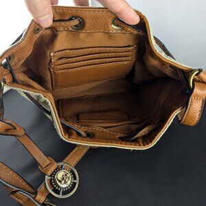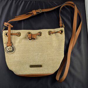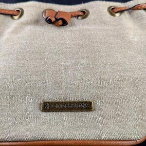 This small-to-medium bucket bag is crafted from neutral tan canvas with rich brown faux leather trim, strap, and interior lining. Antiqued brass grommets and hardware add a rugged yet chic touch. Inside, you’ll find multiple card slots and a slip pocket for essentials.