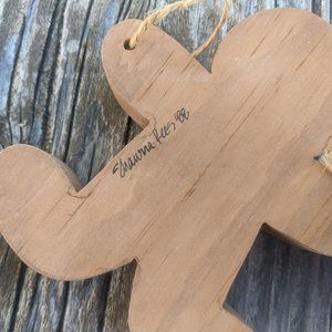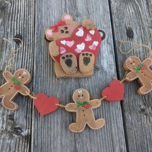 1 wood heart and gingerbread garland; excellent condition, measures 30" from string end to string end, gingerbread men measure 4.25"H x 3.75"W x .75" thick.