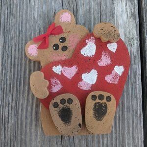 1 wood bear holding a heart; measures 6"W x 7.5"H x 1.5" thick, excellent condition, sits vertical however a picture hanger could be added to the back for wall decor.