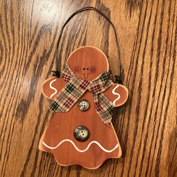 Cute wooden gingerbread man door hanger. Distressed edges. 6” tall, 4.5” wide. 2.25” clearance from top to wire. Excellent condition.