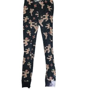Fun leggings with a gingerbread pattern. Perfect for the holiday season. Features playful gingerbread men on a black background.
