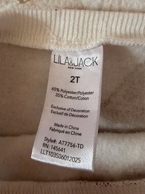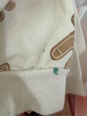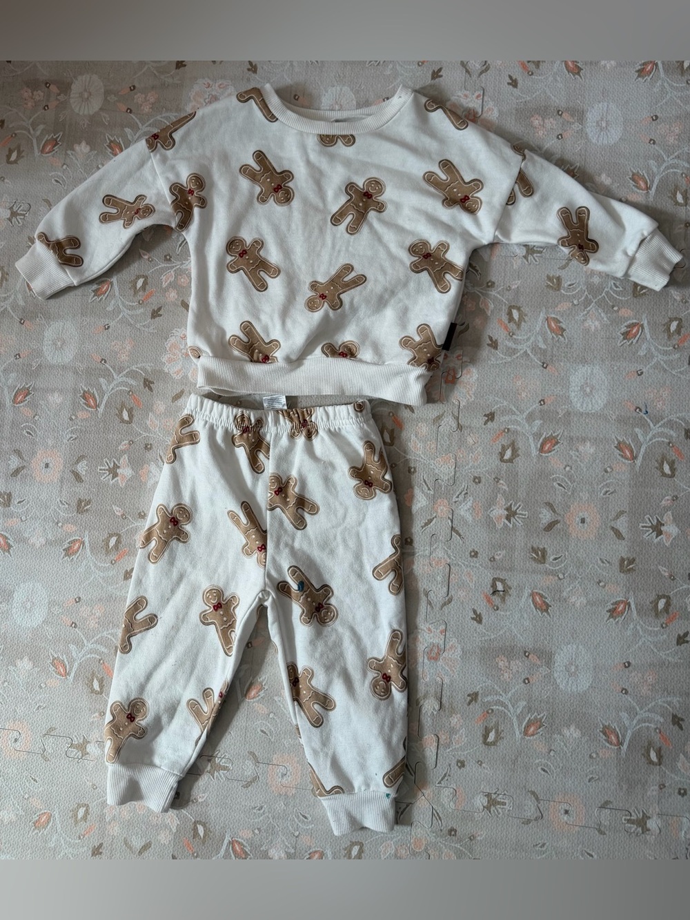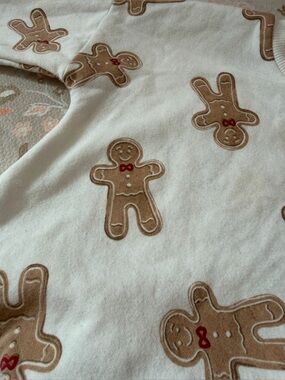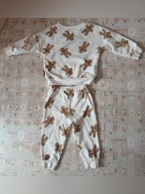 Cozy two-piece kids set with an allover gingerbread print. Soft cream fabric offers gentle comfort for play. Elastic waist and ribbed cuffs ensure a snug, flexible fit. Easy-care material for everyday wear. Fleece lined. Pilling from wear. Small stain (see last image)