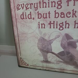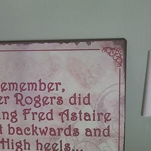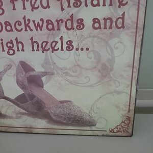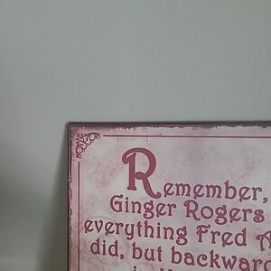 Pre-owned in good condition. 12 inch tin square sign that has dancingshoes and says RemembervGinger Roger's did everything Fred Astaire did, but backwards in High heels. Has two hangers in the back to make it easier to level the sign.