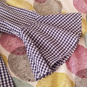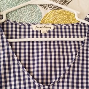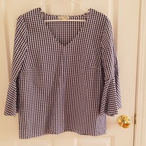 Blue and White Gingham. 3/4 bell sleeve. V-neck. Size Medium. 100% cotton. Very flattering on.
