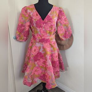Description: Gingham & Heels Pixxie Pink Dress Coquette Girl Barbiecore Coastal Cowgirl 10 AU / 6 US, v neckline, elastic waistline, invisible zip closure, fabric has some give to it, beautiful floral jacquard overlay fabric throughout, dramatic puff sleeves