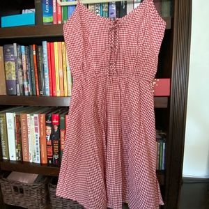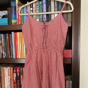 A Gingham mini dress with a beautiful and comfortable material. It has lace infront that you can adjust and a garter in the waist to make it more comfortable. It is still new and never worn. Tag still on and this is authentic from American Rag brand.
