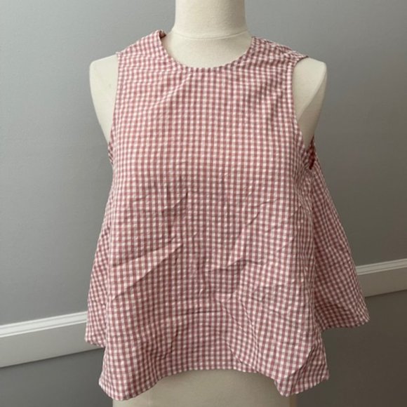 Gingham patterned top in pink and white. Low open scoop in the back. About waist length, and I'm 5'5". This does fit smaller across the shoulders. Never worn.
