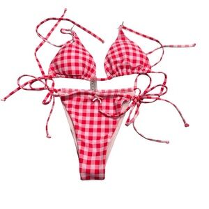 Stylish gingham bikini set in a vibrant pink. Perfect for a day at the beach or poolside lounging.