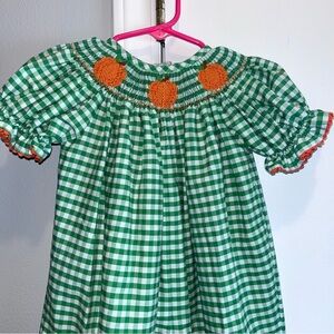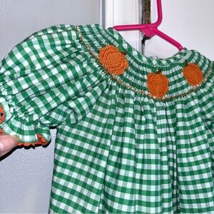 Gingham Print Smocked Embroidered Pumpkins Romper. So Sweet. Green & White Gingham Print, with Puffed Short Sleeves, Ruffles and Ribbon Detailing. Smocked Neckline; Front and back, with Embroidered Pumpkins. Button Closure at Back of the neckline. Full Generous Sizing. Ruffled Hemline. Snap Leg Closure.