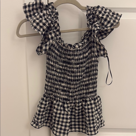 Chic gingham pattern. Features ruffled sleeves. Smocked bodice for a flattering fit. Perfect for casual outings.