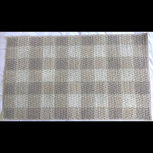 Loop pile plaid mat in neutral cream and tan . // Non-slip . // Check , accent carpet , indoors , kitchen , bath , covered porch , buffalo , tonal , checkered . // Condition excellent , no flaws