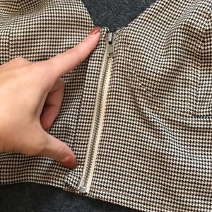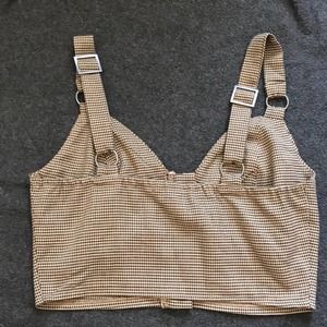 Brown Black and Tan gingham color scheme. Cropped and zip front. Adjustable straps. Size xs. Great condition. Measures pit to pit 14.5 inches, length of body 9.5 inches, total length with straps at the longest 14.5 inches, and total length with straps at shortest is 13 inches