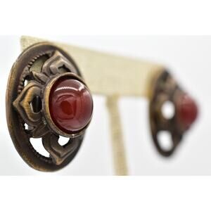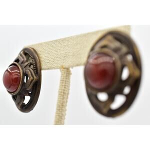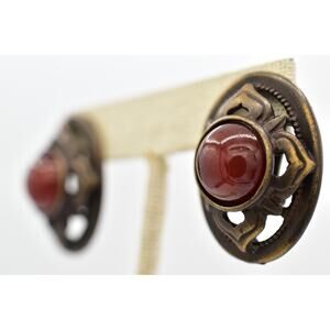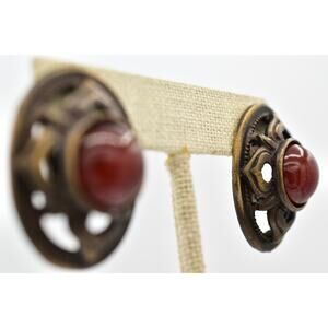 Ginnie Johansen Amber Cabochon Clip On Earrings Brass Tone Signed 1980s BinBK