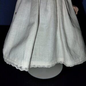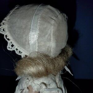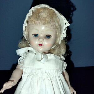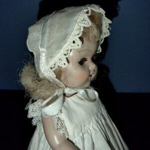 This is Ginny. I just love this little cream colored lace trimmed cotton dress with bonnet, and socks tied in pink ribbon. Included is another one of her dresses, a cute little sailor dress. Her face painting is in perfect condition, with red lips and rosy cheeks. Her blue eyes, complete with lashes, need a little help opening, but lids close when she lies down. Her blonde hair is in good condition for her age and is in its original style. Her body is hard plastic, with arms that move freely, and a head that turns from side to side when walking. The walking mechanism works properly. Measuring 7.5 inches tall, she was manufactured in 1954 by The Vogue Doll Company in the USA. This little darling will melt your heart. She has been well cared for and is in pristine condition. She lived in a smoke free environment for her whole life. The stand is not included.