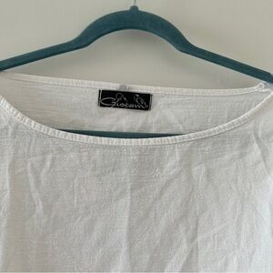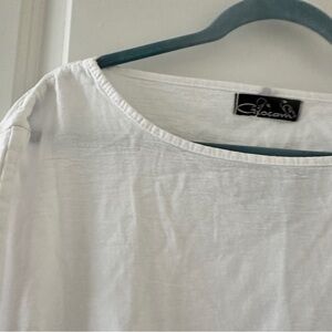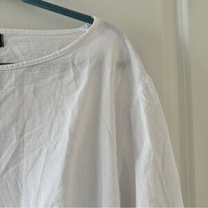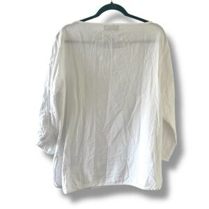 White embroidered tunic top by Giocam. Pullover 3/4 sleeve shirt with ladder slit sleeves and an asymmetrical hemline. Relaxed fit. New with tags.