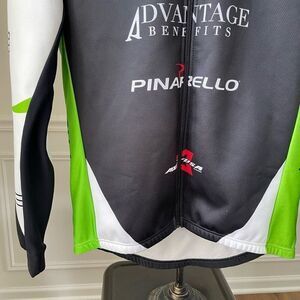 Giordana Priority Health lime green and black full zip cycling jersey jacket with all over advertising and water bottle pouches along the lower back. Laying flat measures 26 inches shoulder to hem with an additional 4 inches in the back and 22 inches armpit to armpit From rubbing. No holes or anything like that, it’s more like light color fuzziness. Polamide. Please note that the interior is very lightly fleeced. This is still a lightweight jacket.
