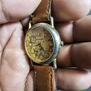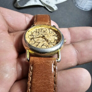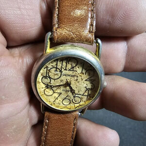 Giordano ladies quartz fashion watch gold tone cork style dial brown strap shows signs of wear such as scratches and discoloration works see pictures for reference
