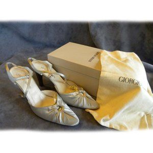 Giorgio Armani women silver satin luxury pumps, have a classic pointed toe with adjustable ankle strap. size 40 - heel approx 4" - 100% Authentic - used few times - made in Italy - Includes Giorgio Armani box and dust bag.