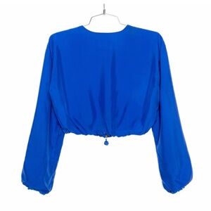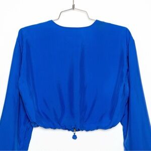 Cheongsam-inspired blouson with long bishop sleeves, V-neckline, and tasseled zip closure with gold hardware. Lined in tonal silk chiffon. Silk is excellent; tag removed but brand label and ref. numbers intact.